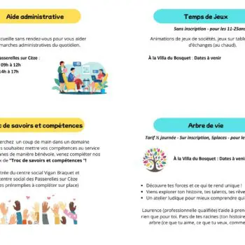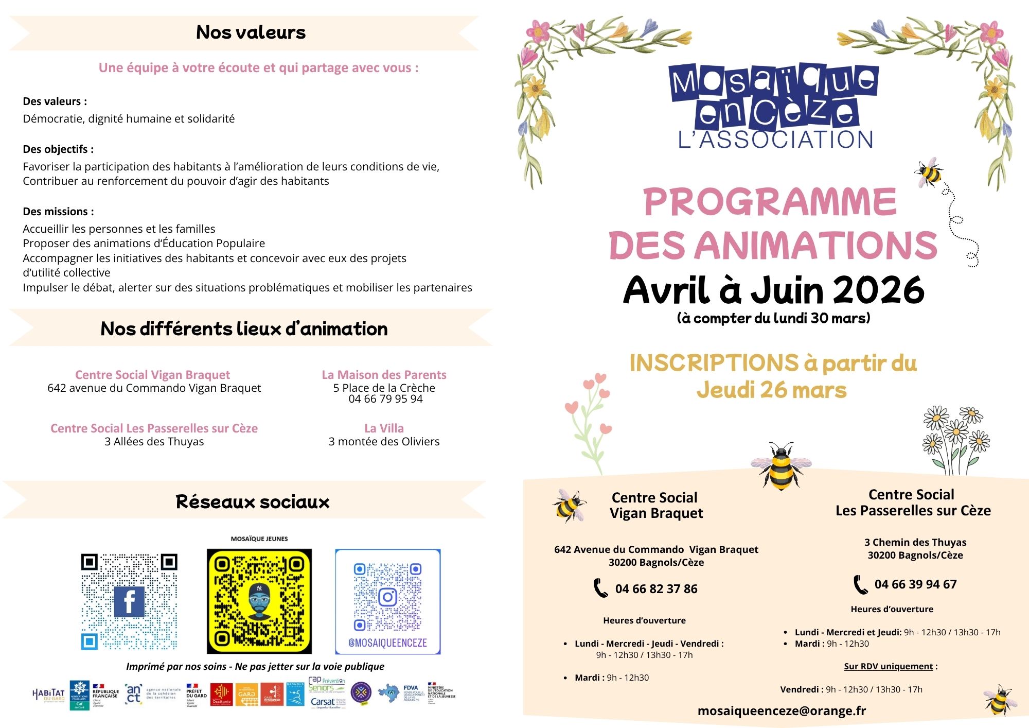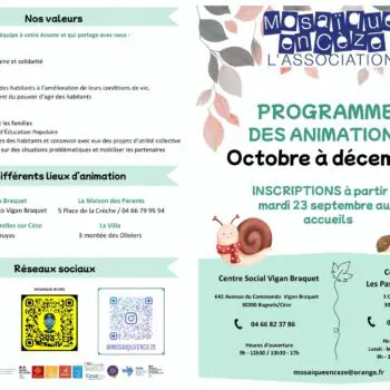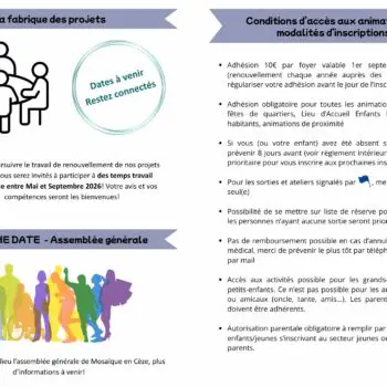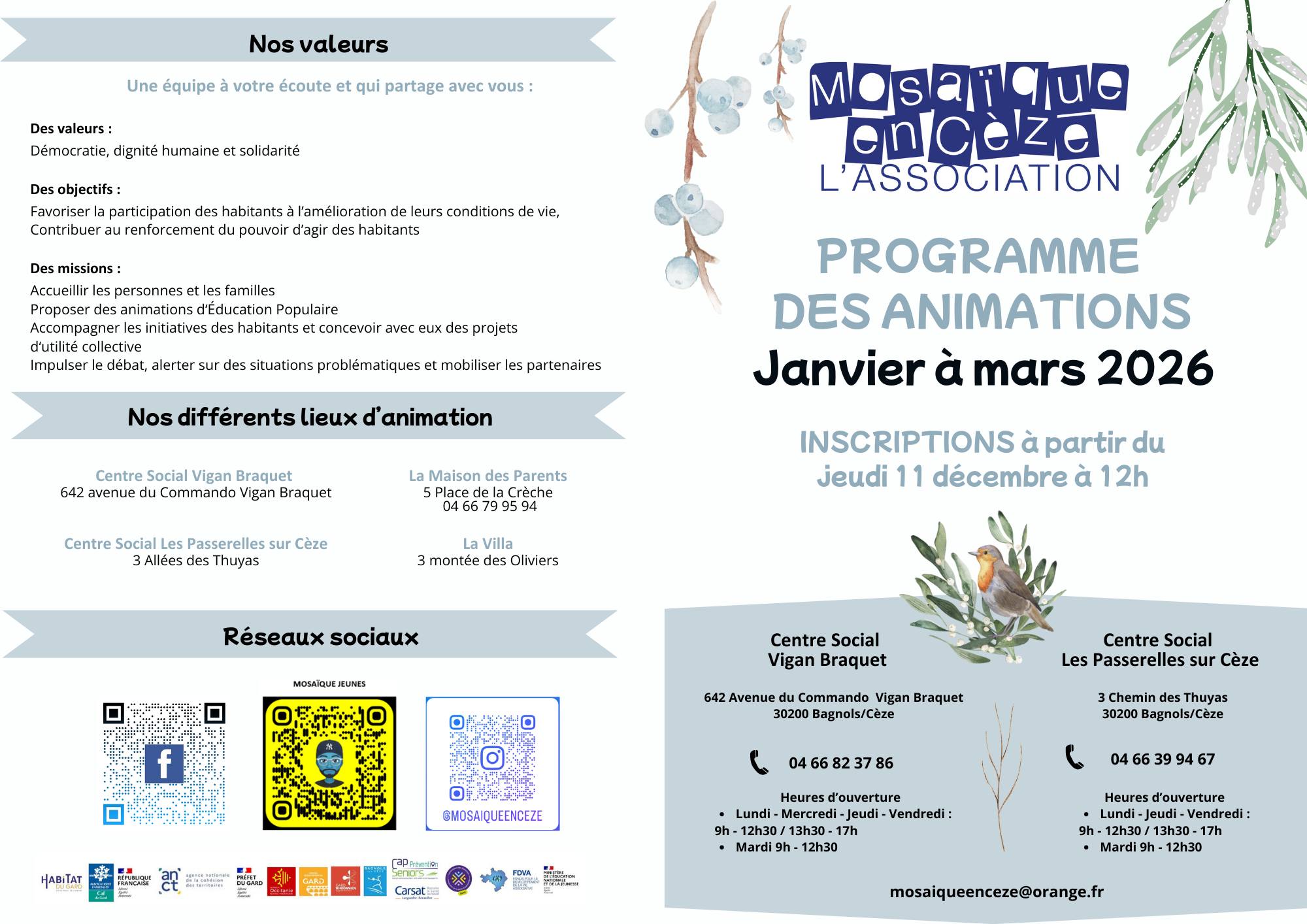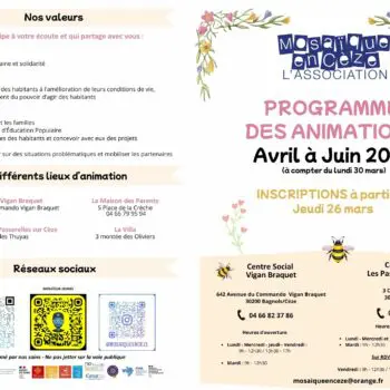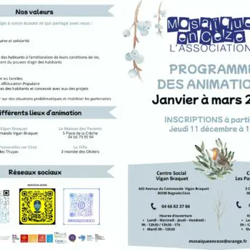 Mosaïque en Cèze est une association apolitique et laïque. Elle est ouverte à tous, habitants de Bagnols sur Cèze, du Gard Rhodanien et d’ailleurs.