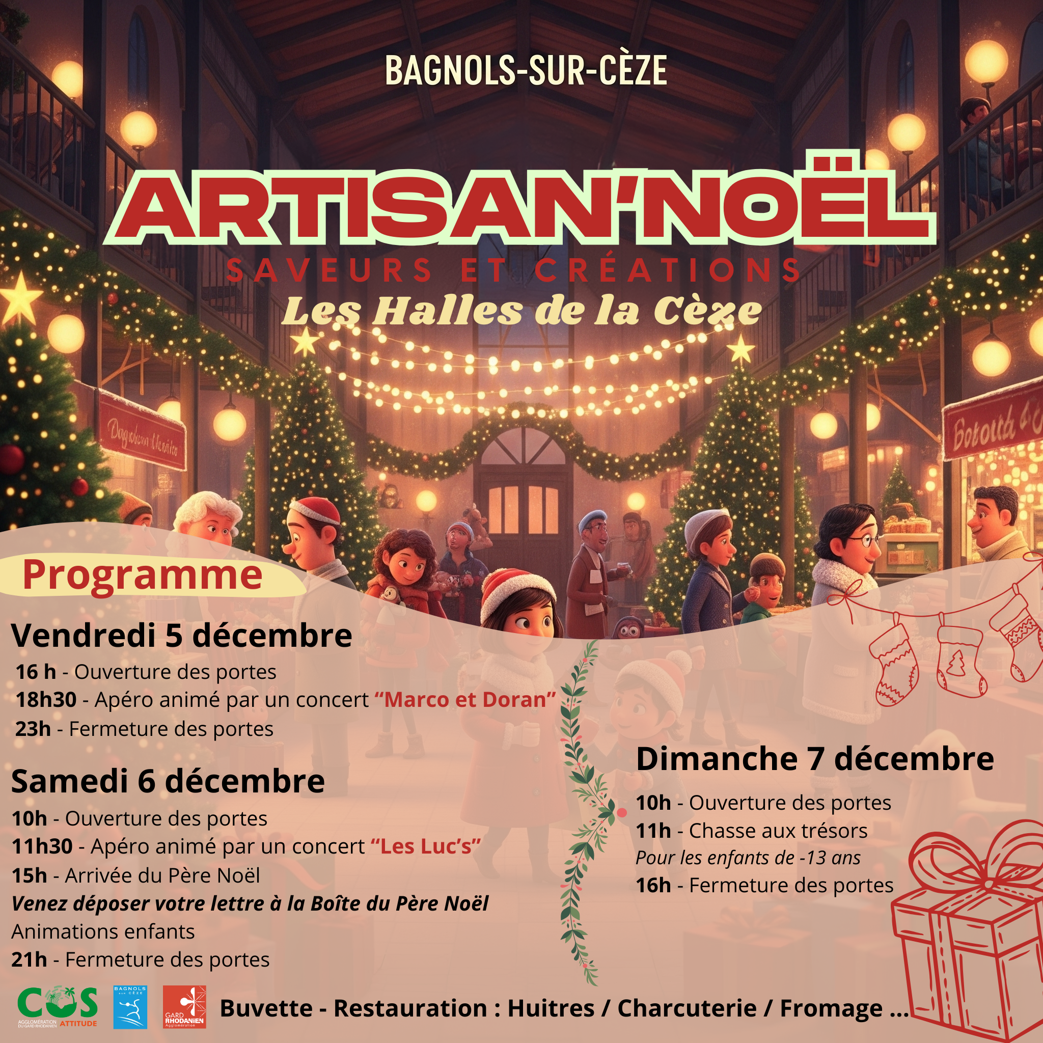 L’association le Cos de l’Agglomération du Gard rhodanien organise « Artisan‘noël » du vendredi 5 au dimanche 7 décembre 2025 aux halles de la Cèze à Bagnols-sur-Cèze.