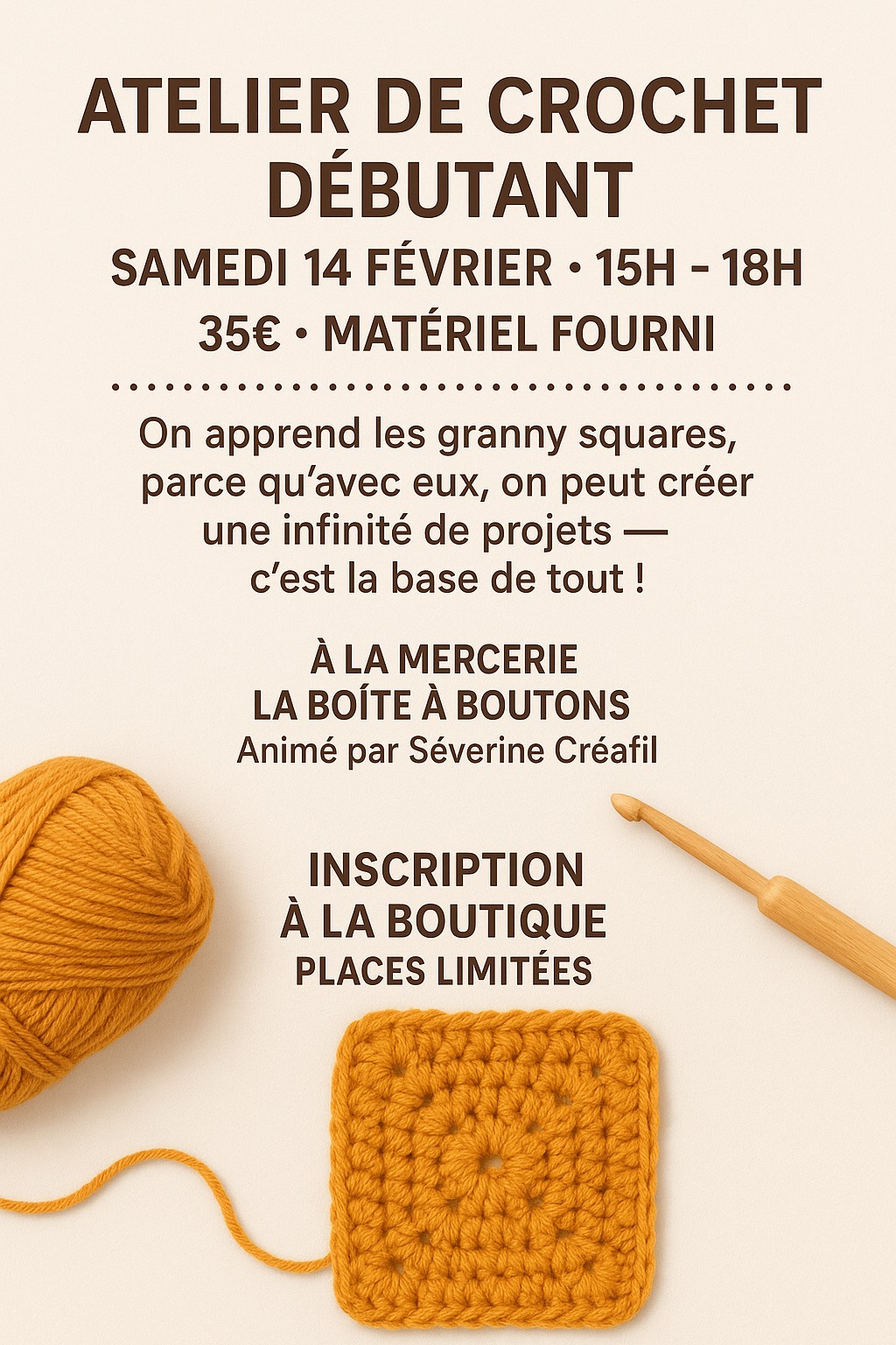 La mercerie, La Boîte à Boutons organise un atelier de crochet débutant, le samedi 14 février, de 15h à 18h. Séverine Créafil apprendra aux participants les granny squares, ces petits carrés mythiques qui ouvrent la porte à une infinité de créations.