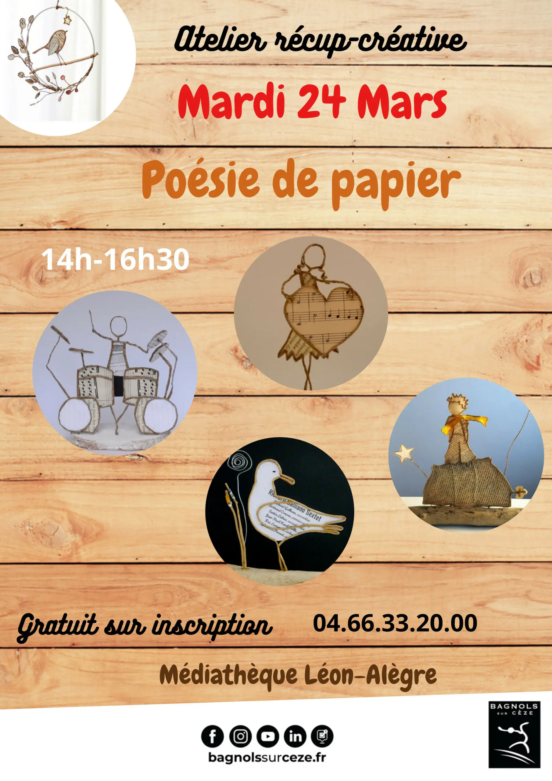 La médiathèque Léon-ALègre organise un atelier récup’ « poésie de papier », le mardi 24 mars, à 14 heures. Venez apprendre à réaliser des sculpture avec du papier décoratif et du fil kraft armé.