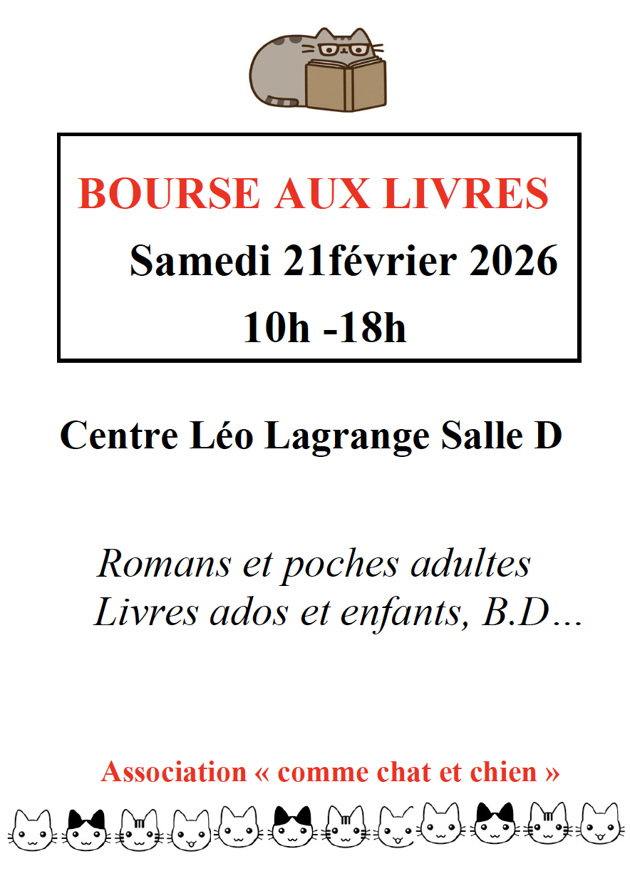 L’association Comme Chat et Chien organise le samedi 21 février, de 10h à 18h, dans la salle D du Centre Léo-Lagrange, sa bourse aux livres.