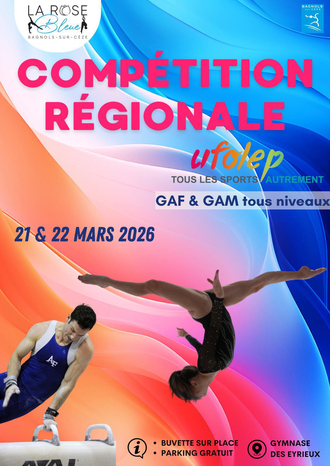 L’association de gymnastique, La Rose Bleue accueille une compétition régionale Ufolep de gymnastique les 21 et 22 mars 2026, au gymnase des Eyrieux.