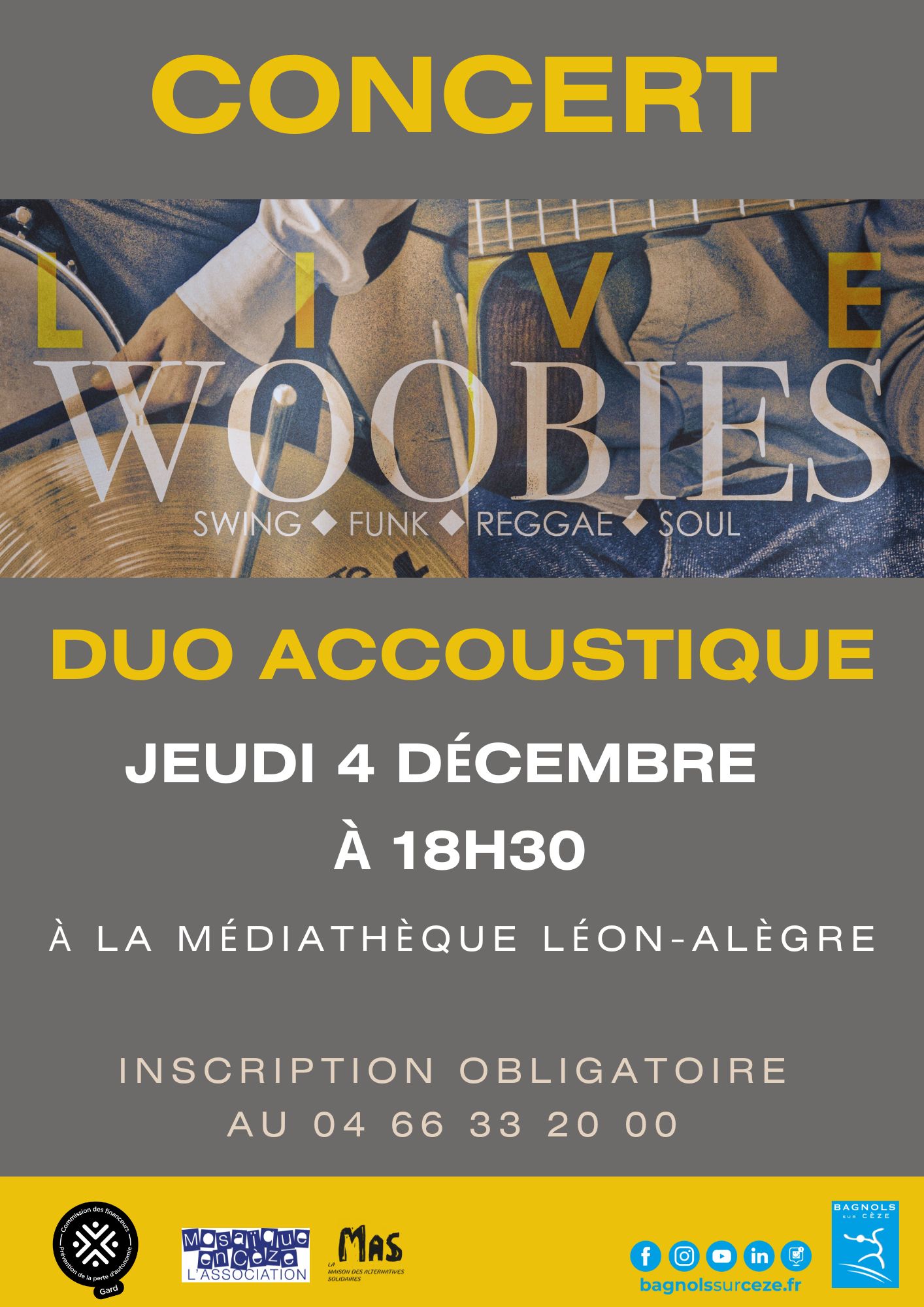 La Médiathèque organise un concert, le jeudi 4 décembre, à 18h30. Avec un son authentique tout droit sorti des années 60-70, un voyage au coeur du swing, de la soul, de la funk ou encore du reggae roots, les Woobies viendront faire découvrir leur répertoire au public de la médiathèque.
