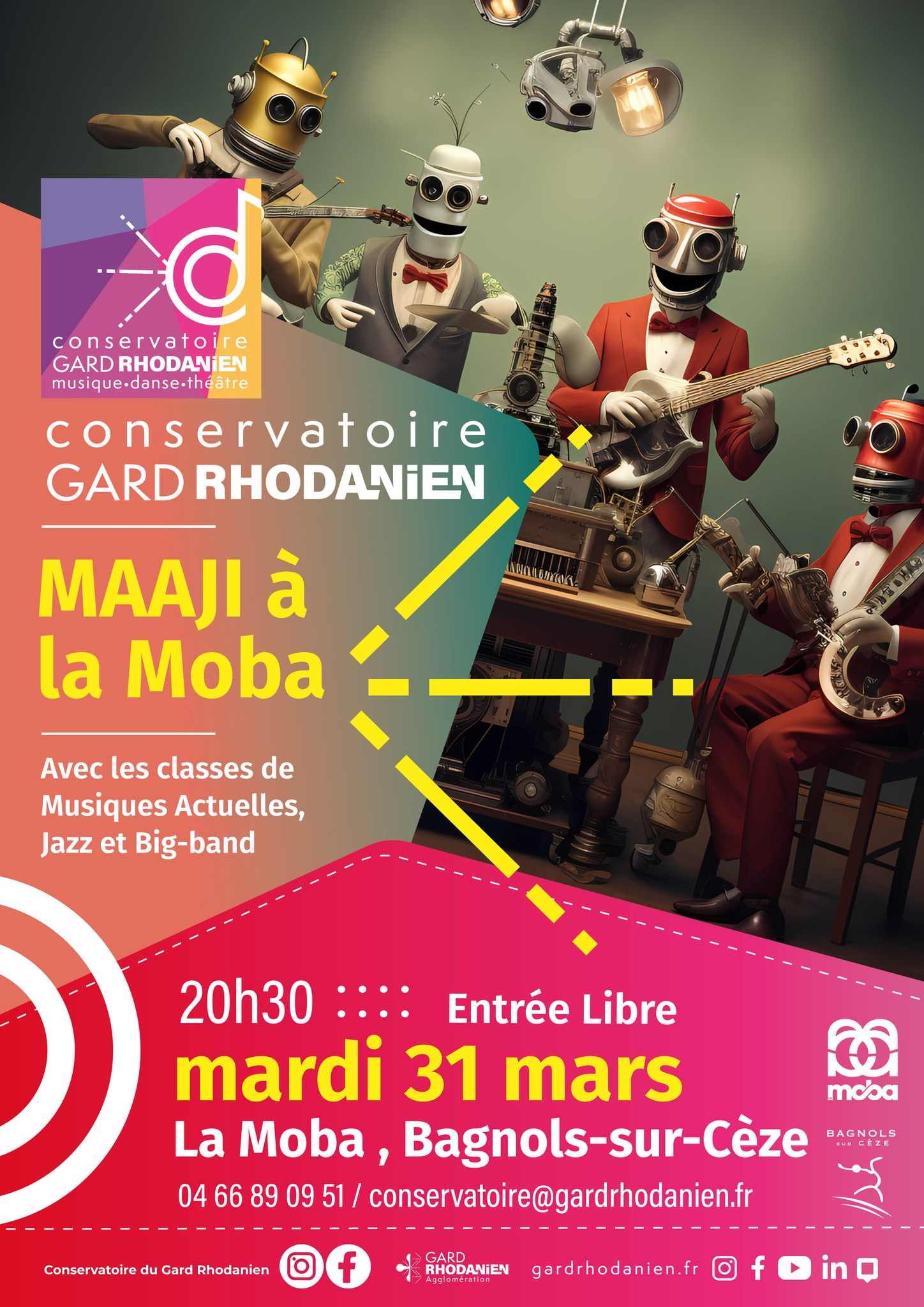 Le Conservatoire du Gard rhodanien s’invite à la Moba, le mardi 31 mars, à 20h30 pour le concert des classes de Musiques actuelles, Jazz et Big-Band. Le groupe MAAJI sera en concert à la Moba.