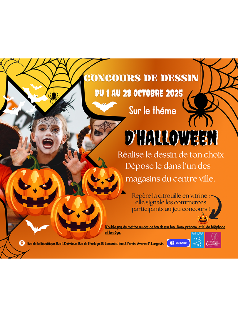 L’association Bagnols Commerces organise pendant tout le mois d’octobre un concours de dessin sur le thème d’Halloween. Du 1er au 28 octobre 2025, réalise le dessin de ton choix et dépose-le dans l’un des magasins partenaires du centre-ville. Pour savoir quelle boutique participe, il suffit de repérer la citrouille en vitrine.