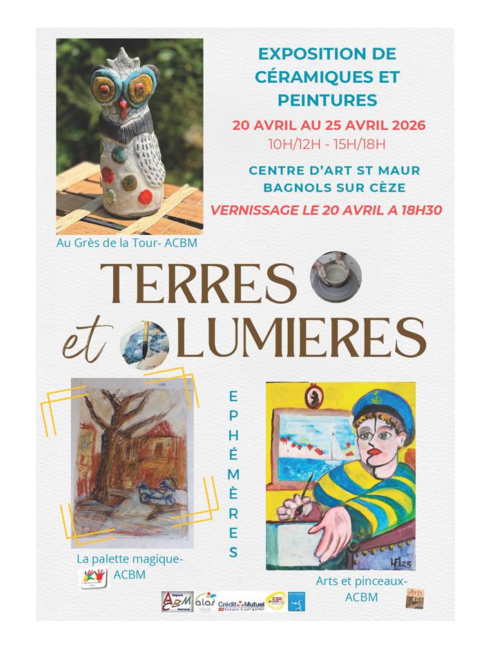 Les associations Au Grès de la Tour, La Palette Magique et Arts et pinceaux organisent une exposition de céramiques et de peintures, du 20 au 25 avril (10h-12h / 15h-18h) au centre d’Art rhodanien Saint-Maur. Le thème de l’exposition est « Terres et lumières ».