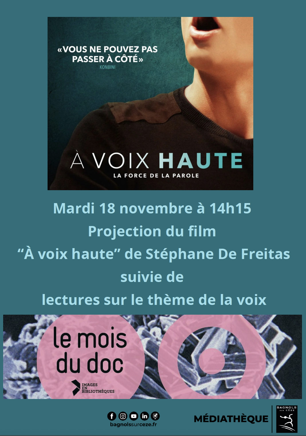 La Médiathèque organise la projection du film documentaire « À voix haute », réalisé par Stéphane de Freitas et Ladj Ly, le mardi 18 novembre, à 14h15. Il revient sur le concours « Eloquentia » qui vise à élire, chaque année à l’université de Saint-Denis, le « meilleur orateur du 93 ».