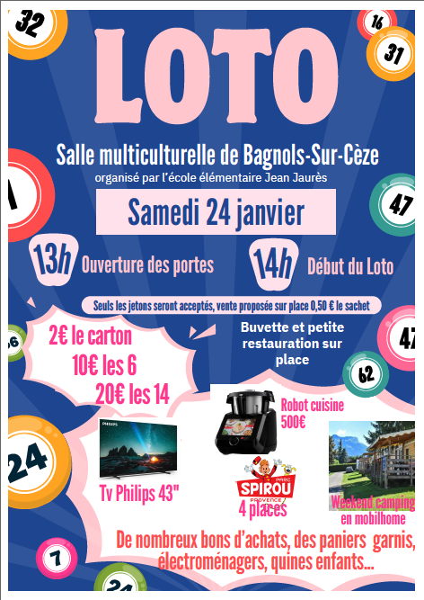 L’Association des Parents d’élèves de l’école Jean-Jaurès organise son loto annuel le samedi 24 janvier, à 14 heures, à la salle multiculturelle. Ouverture des portes à 13 heures.