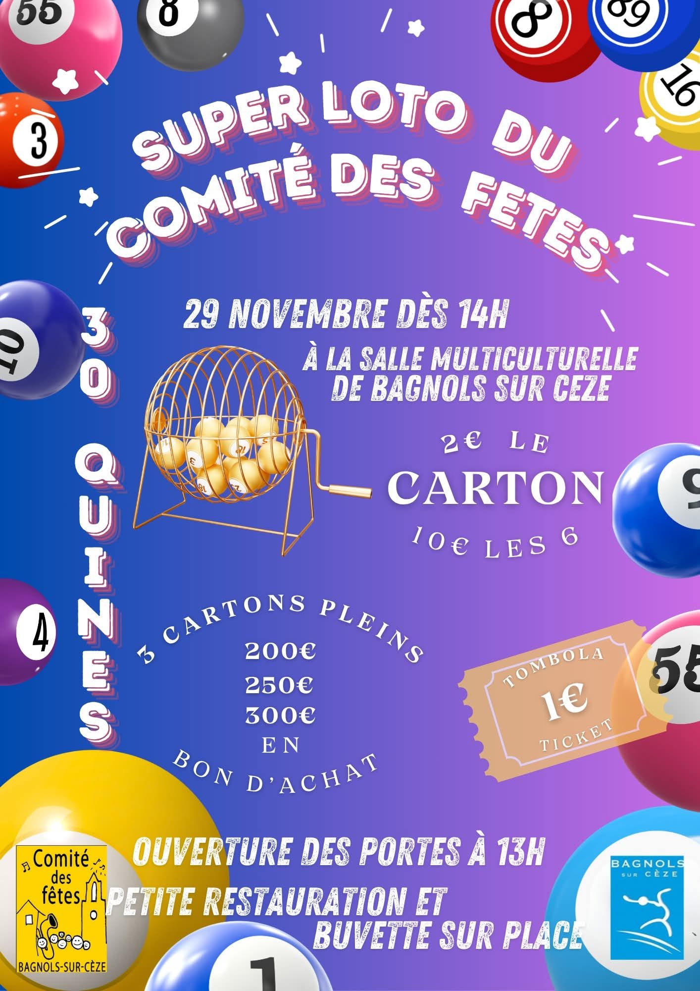 Le Comité des Fêtes de Bagnols-sur-Cèze organise son loto, le 29 novembre prochain, à partir de 14 heures, à la salle multiculturelle. Ouverture des portes à 13 heures.