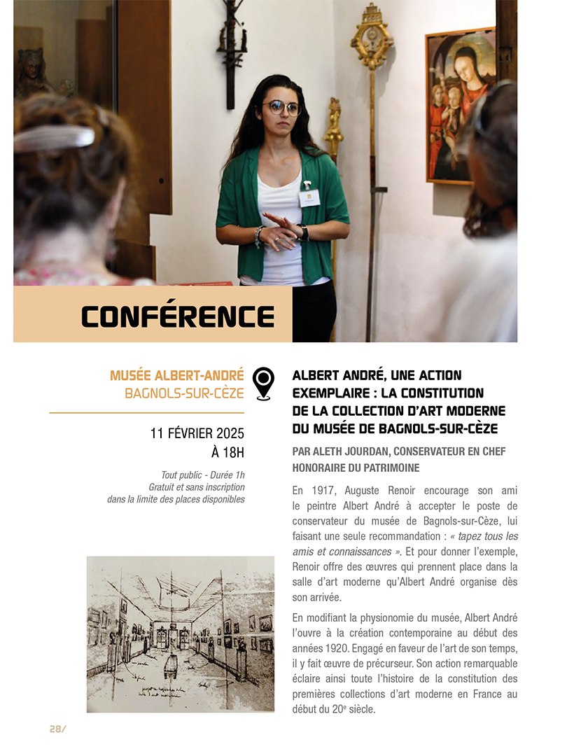 Cette conférence, intitulée « Albert André, une action exemplaire : la constitution de la collection d’art moderne du musée de Bagnols-sur-Cèze » sera donnée par Mme Aleth JOURDAN, conservateure en chef honoraire du patrimoine, dans le cadre de l’exposition temporaire « De Renoir à van Dongen« .