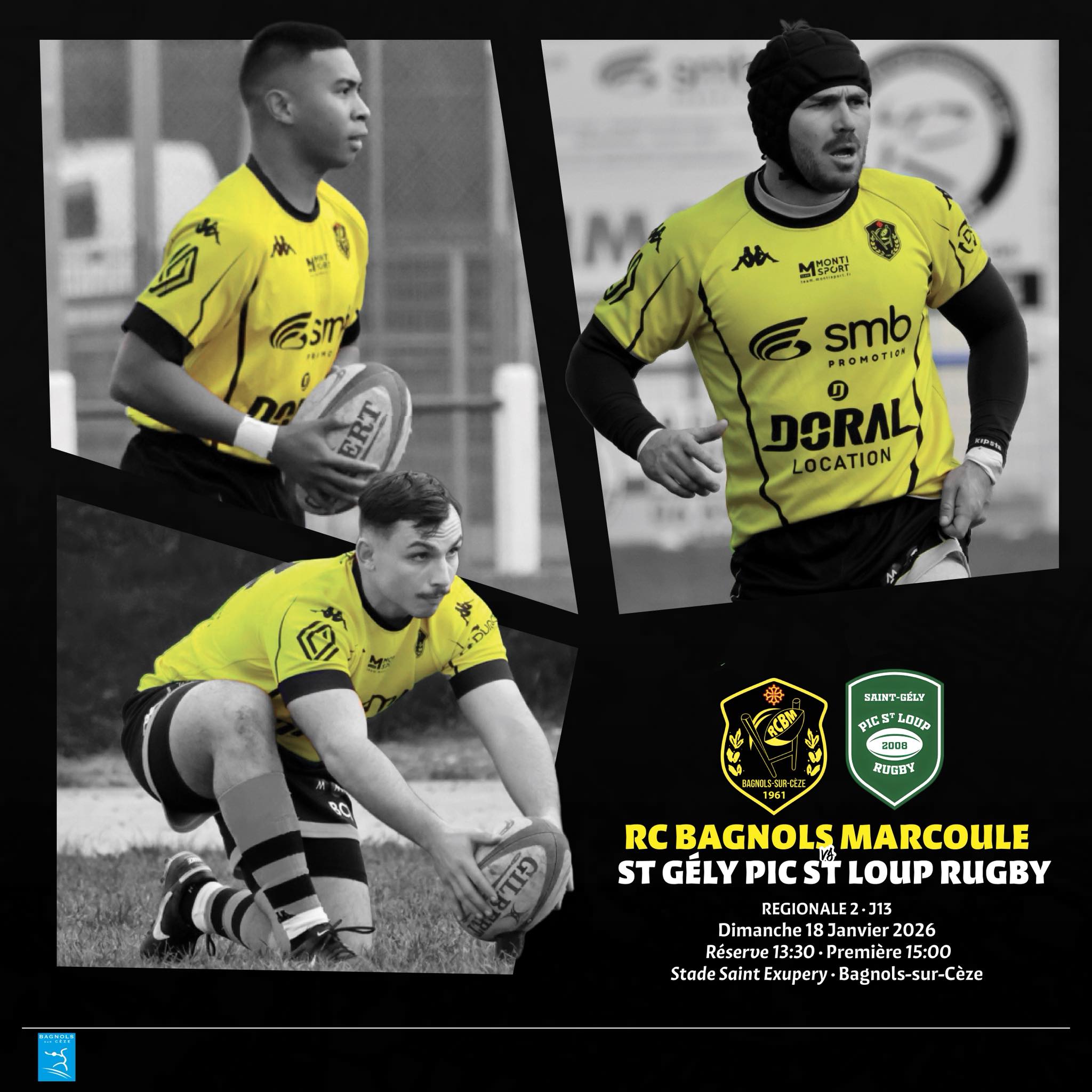 Dimanche 18 janvier, le Rugby club Bagnols Marcoule reçoit l’équipe de Saint-Gély-Pic-Saint-Loup, premier de la poule. La réserve sera sur le stade à 13h30 avant de laisser la place à la première, à 15 heures.