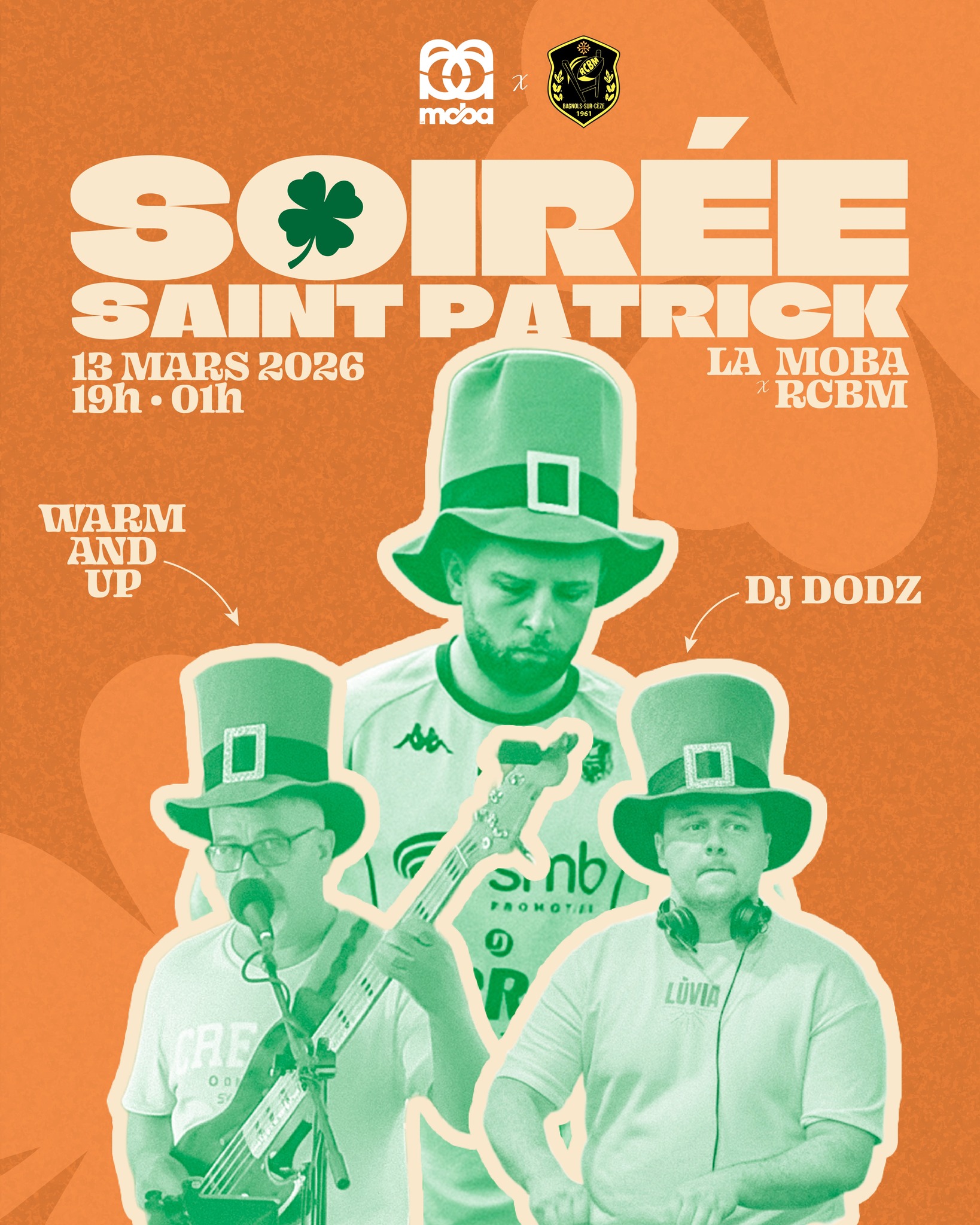 Le Rugby club Bagnols Marcoule et la Moba organisent leur Saint-Patrick, le vendredi 13 mars, à partir de 19 heures. Le groupe Warm Up et le DJ Dodz animeront la soirée.