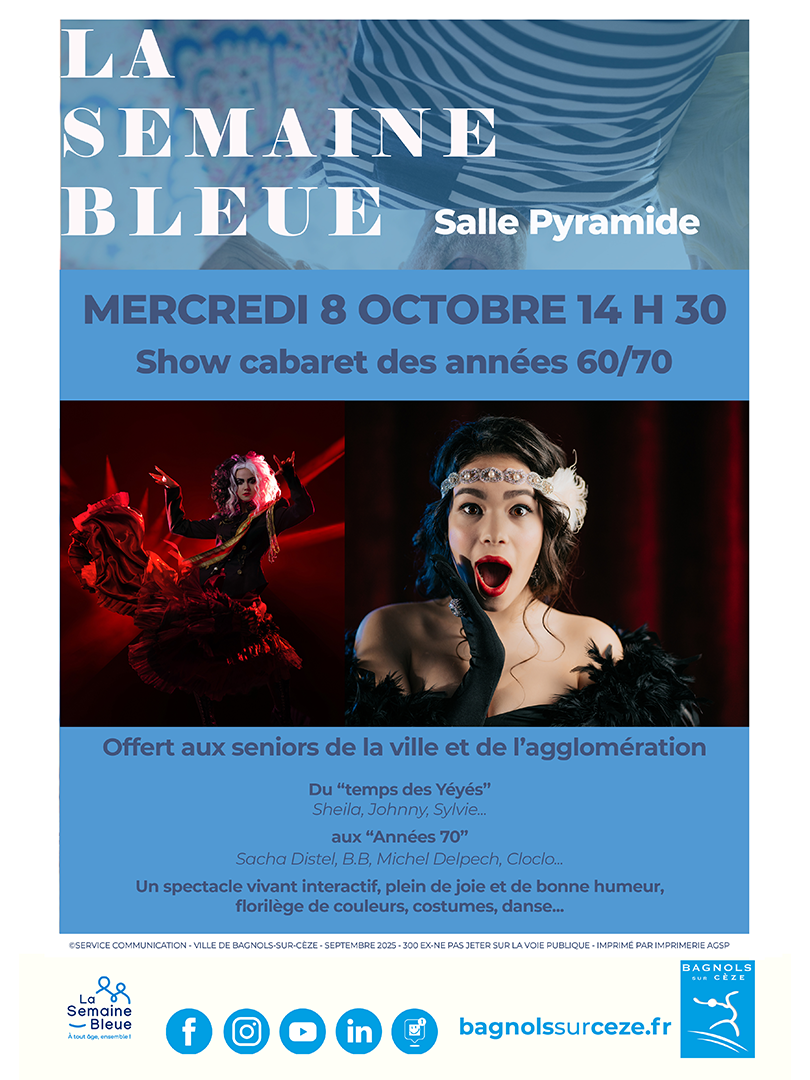 Dans le cadre de la Semaine Bleue, un show cabaret des années 60-70 est proposé aux seniors de la Ville et de l’Agglomération du Gard Rhodanien, le mercredi 8 octobre, à 14h30, à la Pyramide.
