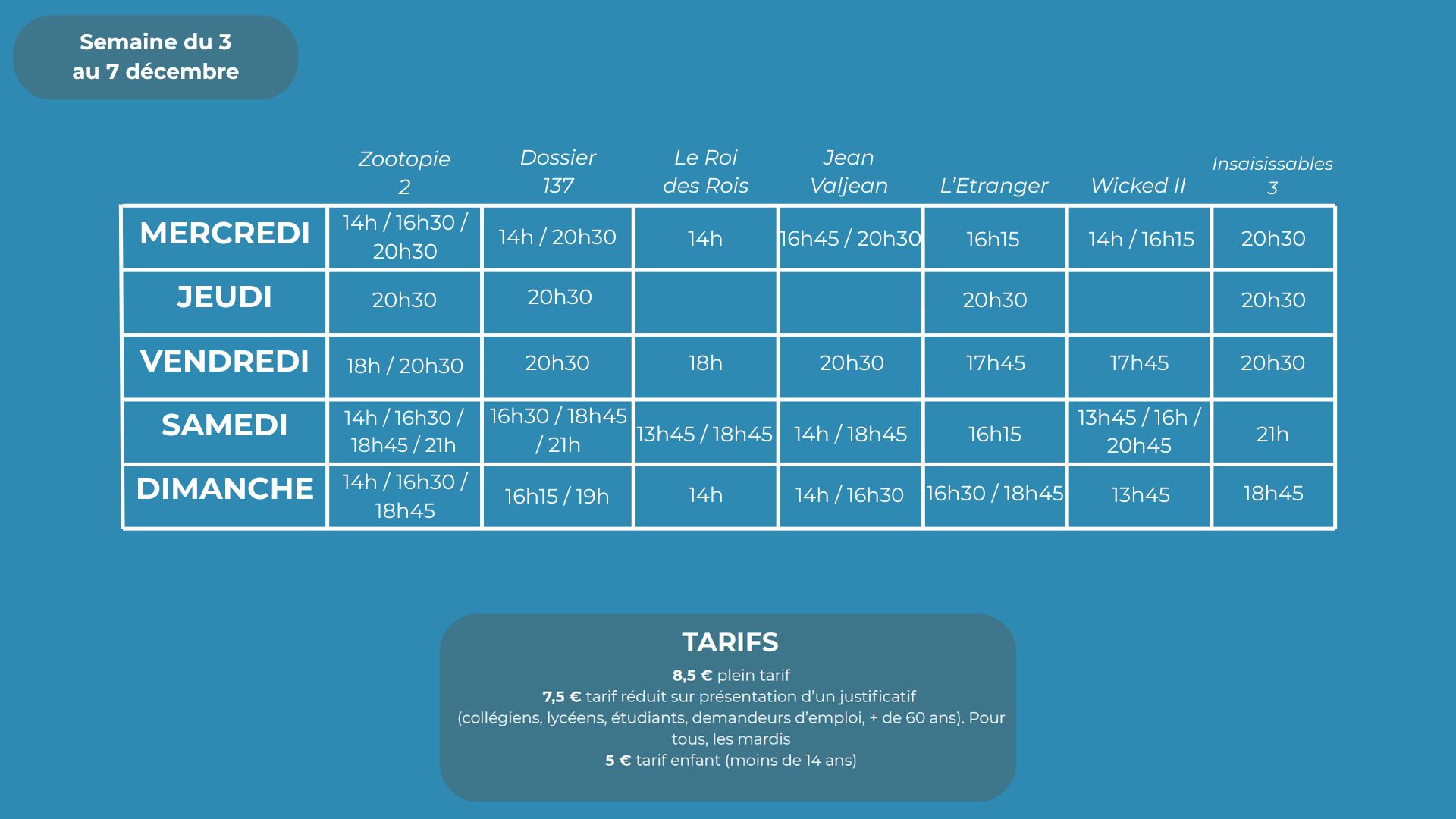 Zootopie 2, mercredi 14h, 16h30, 20h30 / jeudi 20h30 / vendredi 18h, 20h30 / samedi 14h, 16h30, 18h45 et 21h / dimanche 14h, 16h39 et 18h45